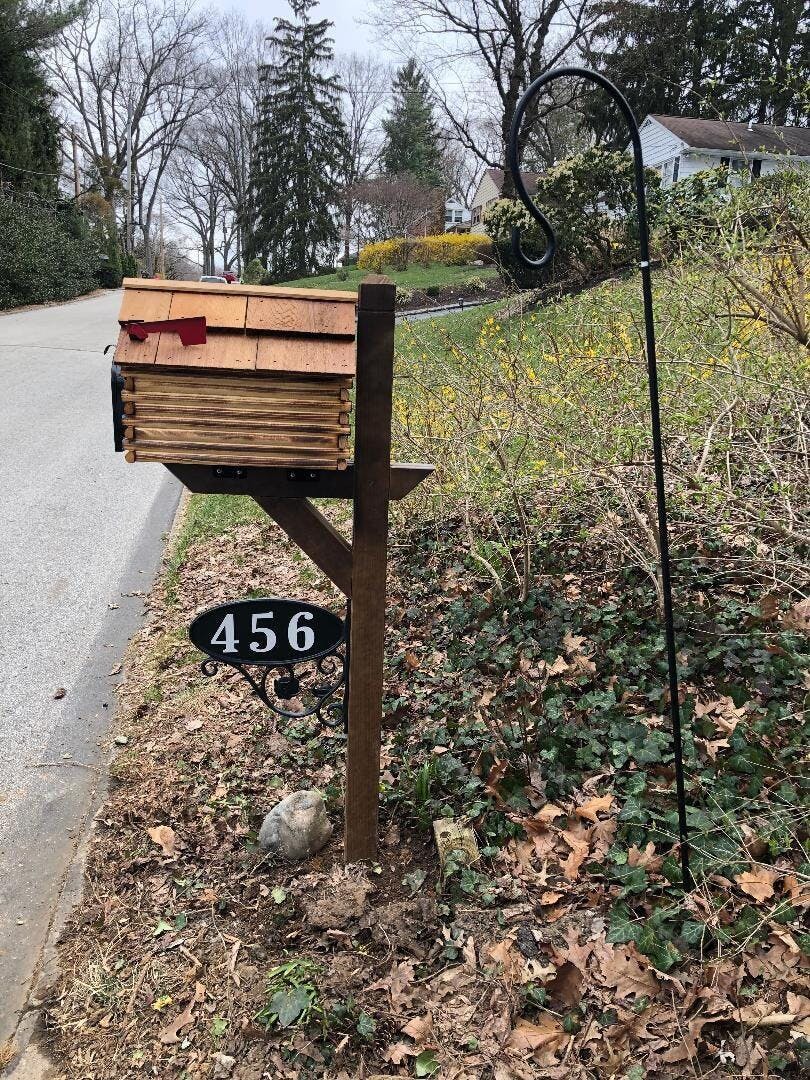 Southern pine premium wooden mailbox post, will not bend over time, fits all our mailboxes! The post is being cut at the workshop into 3 pieces (post, arm, and arm support) for easy assembling, screws included. 7 ft high, 25 lb.