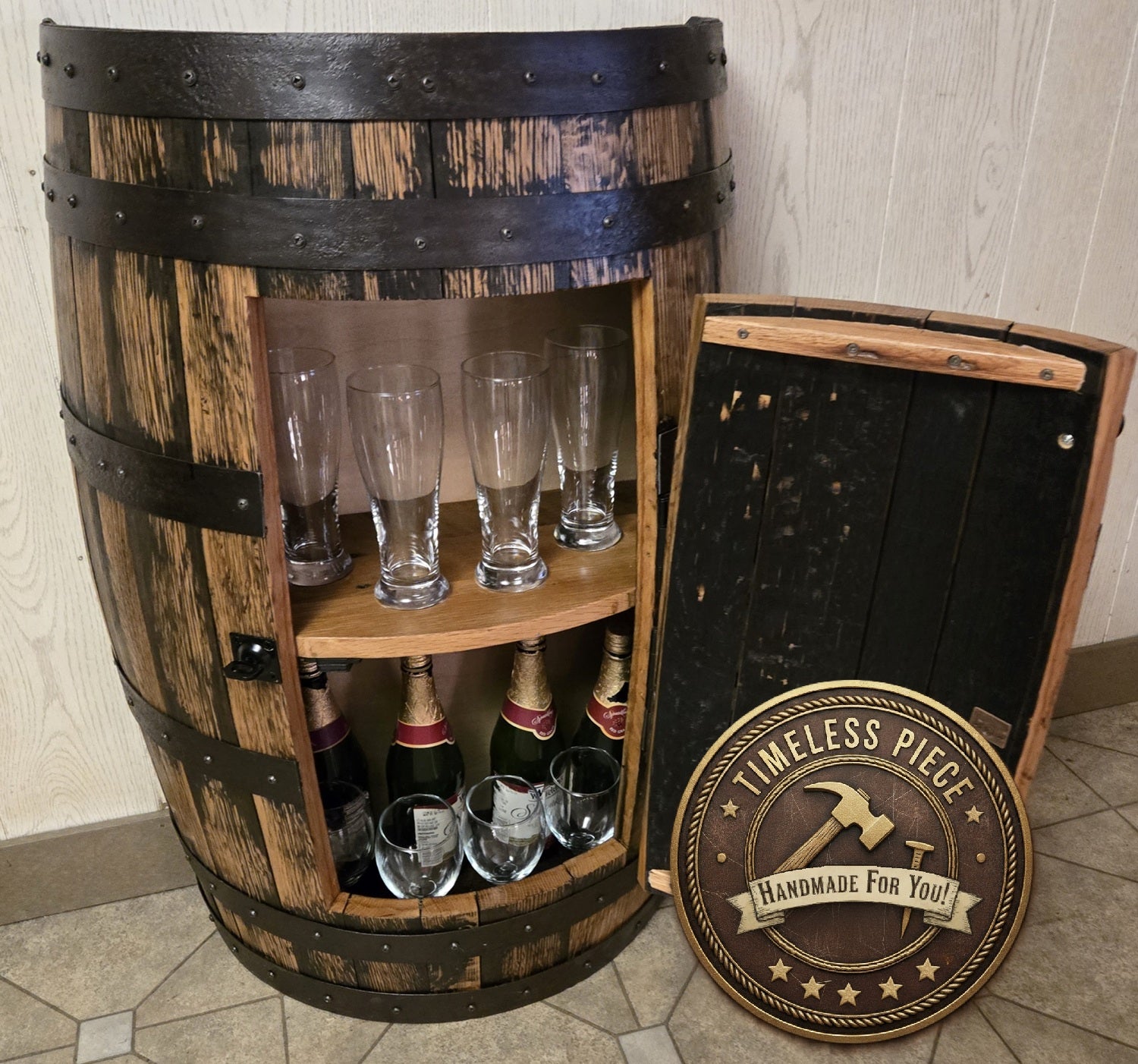 A one-of-a-kind creation inspired by the depth of premium spirits, featuring a design that featured a half whiskey barrel, capturing a rustic yet sturdy charm. Blending visual appeal with functionality, it offers an elegant tribute to whiskey culture, providing the perfect space to showcase and store your favorite bottles and glasses.