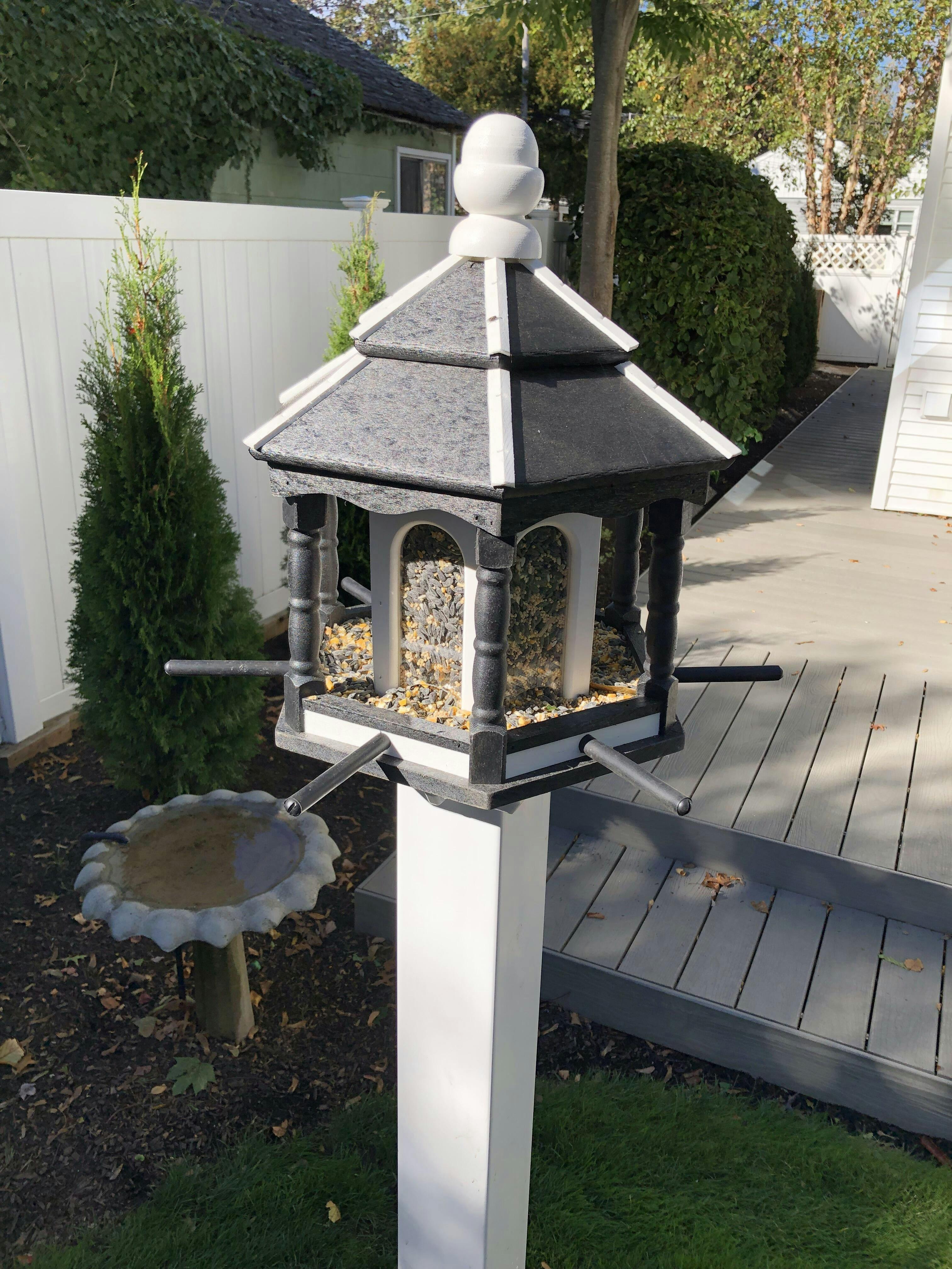 Gazebo Bird Feeder - Amish Handmade - Poly Lumber Weather Resistant - Large Feeding Opening - Medium/ Large -Backyard- Bird Lovers- Outdoors - Black + White / Medium is backordered and will ship as soon as it is back in stock.
