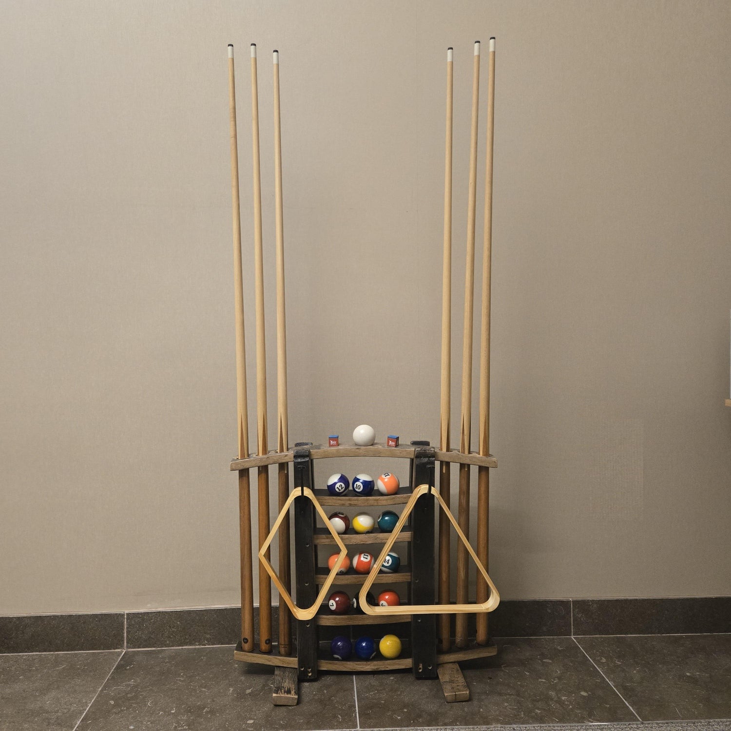 Enhance your game room with a unique barrel cue rack crafted for the billiards enthusiast, combining style and function to elegantly showcase your pool equipment.