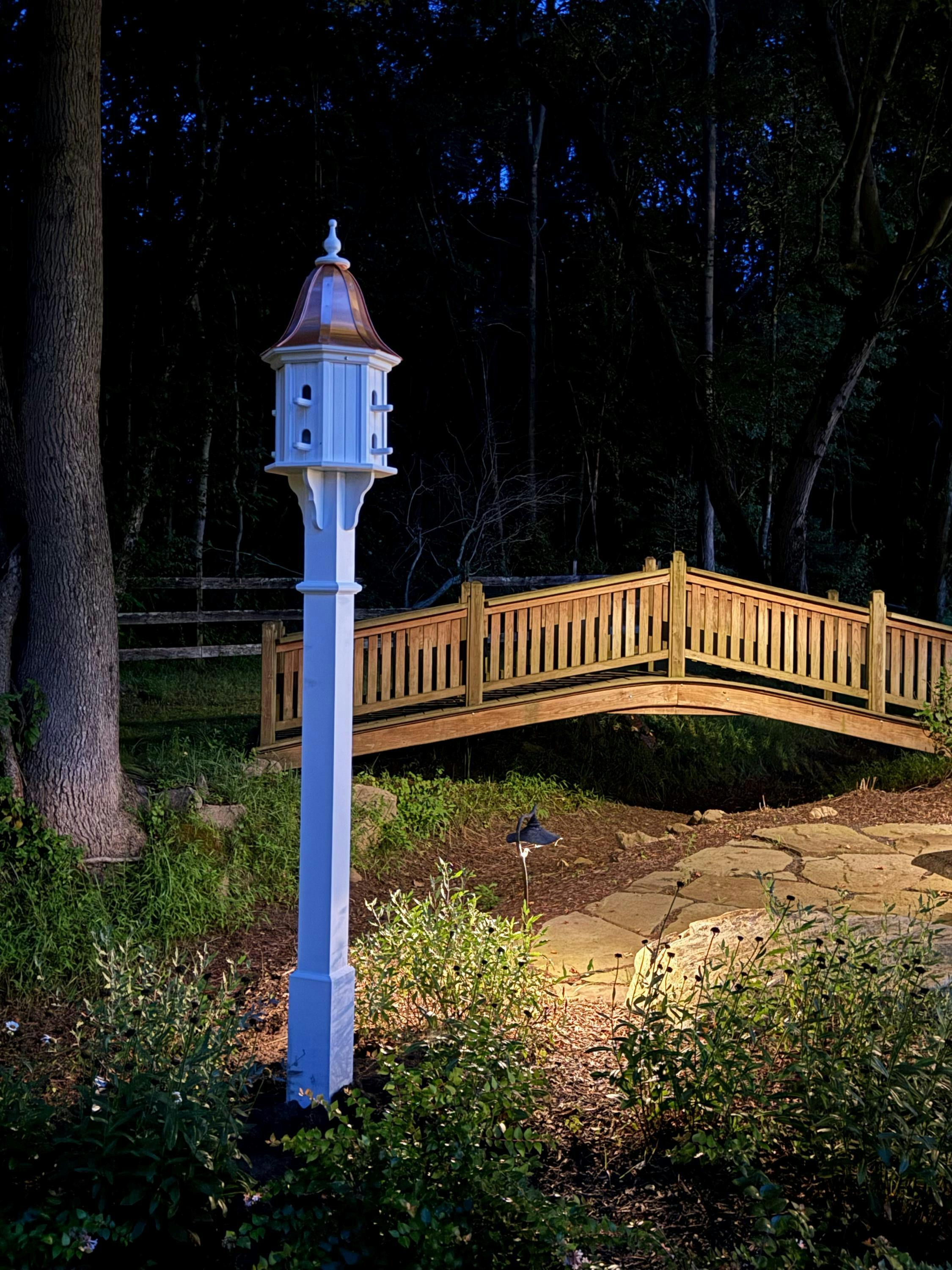 This bell-shaped copper roof birdhouse will stand out in any flower garden, yard, or nature sanctuary! Extra large, 2 story 8 compartments octagon shape house.