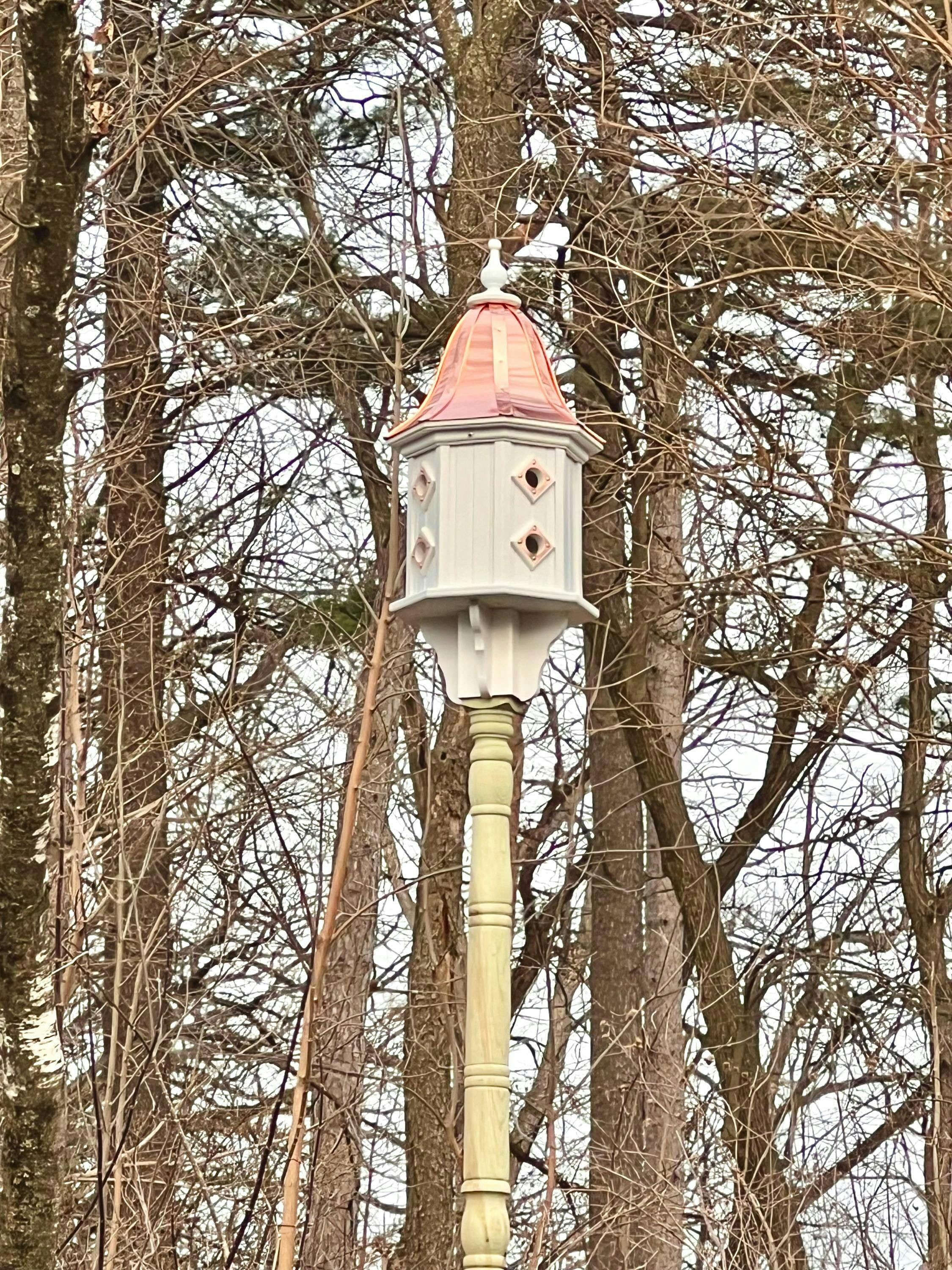 * The roof is made of real copper and constructed for removability to make nest check and seasonal clean out quick and easy to keep it usable for the next year, a white finial tops the piece.