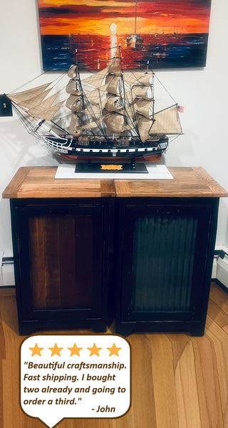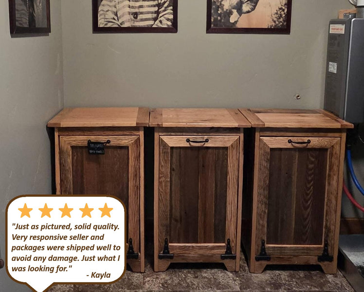 3. Material: Reclaimed wood, reclaimed tin (for trash bins with tin door).